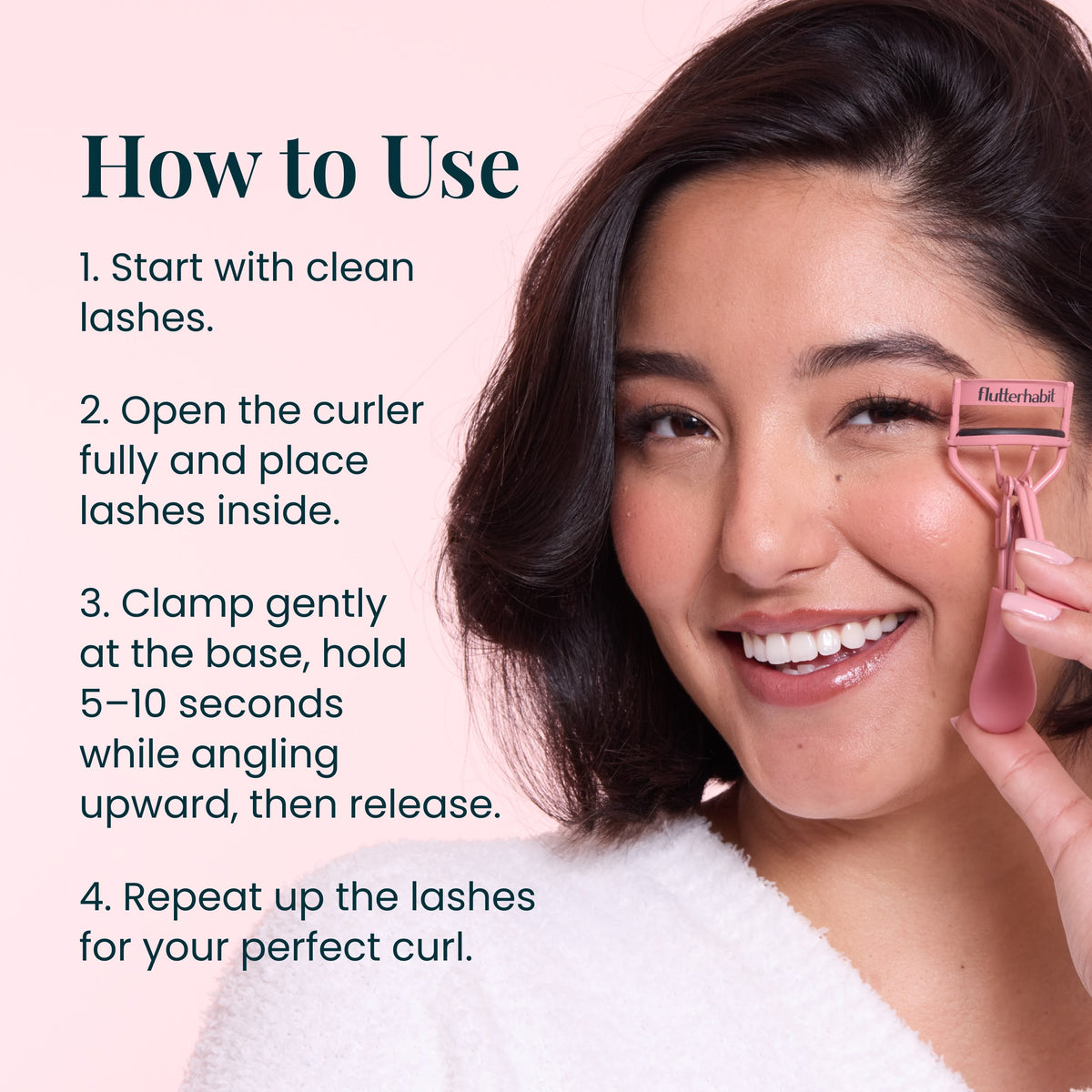 Start with clean lashes. Open the curler fully and place lashes inside. Clamp gently at the base, hold 5-10 seconds while angling upward, then release. Repeat up the lashes for your perfect curl.
