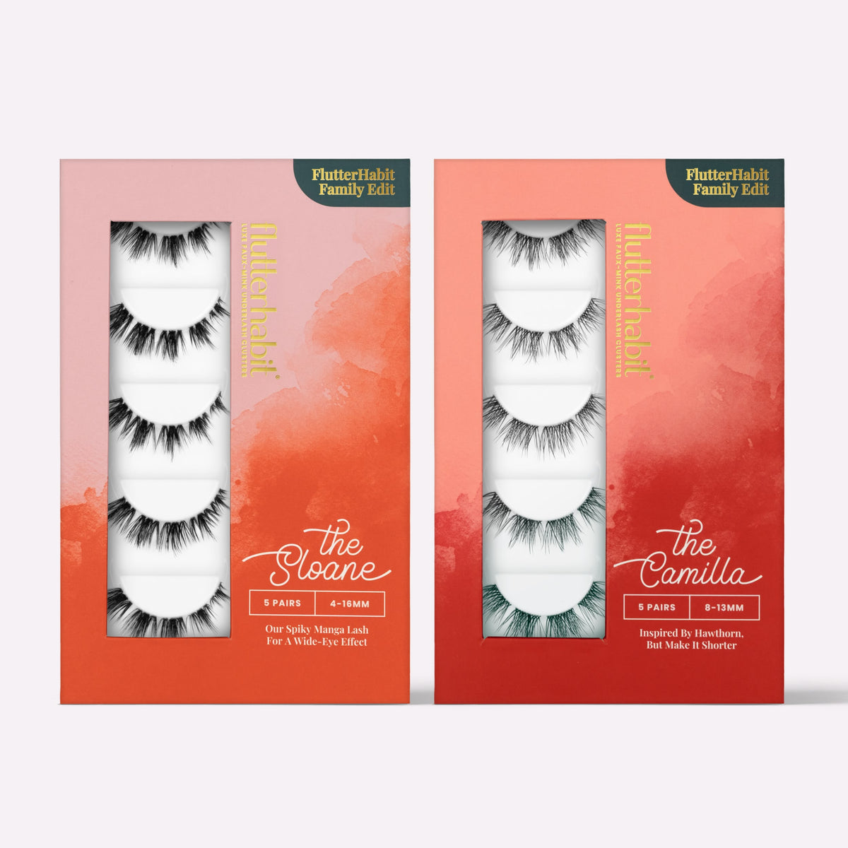 Two lashes, two vibes. The Camilla delivers a sweet, natural lift with its shorter, doll-eye design, while The Sloane adds artistic edge with its spiked, cat-eye shape and wide-eyed finish. Together, they create a curated lash wardrobe that lets you choose soft or statement-making in seconds.